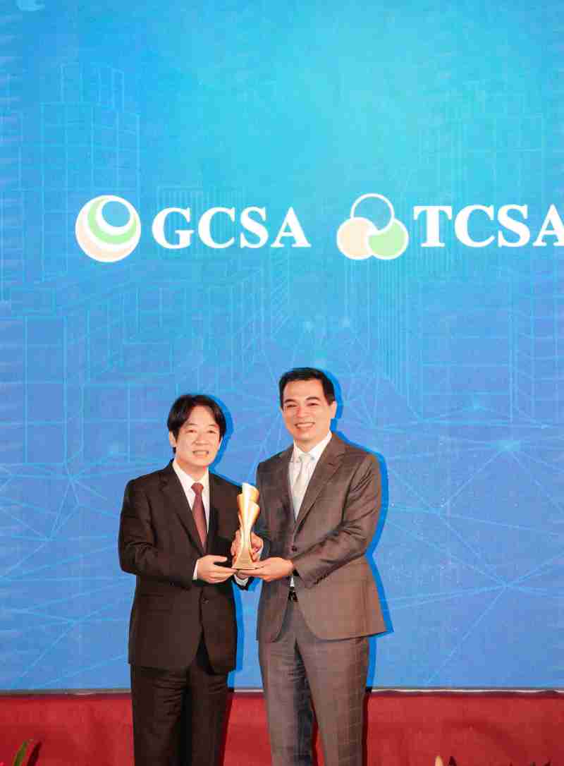 达全方位永续表现获全球永续奖及台湾永续奖肯定,,,,由副总统赖清德颁奖 (左),,,尊龙z6总经理柯富仁 (右) 代表领奖