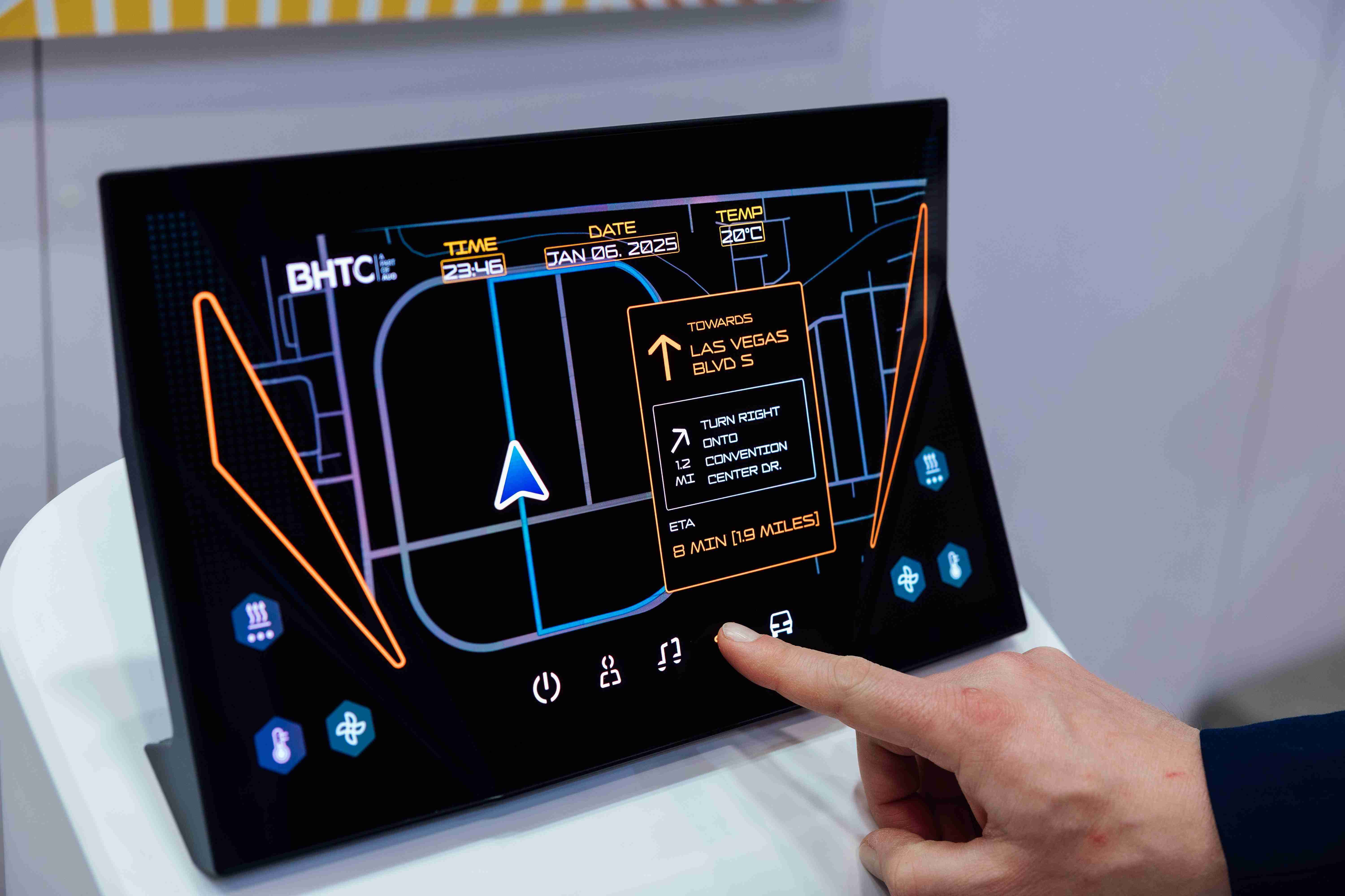 Micro LED可折迭触控显示器(Haptifold Display)结合BHTC多年HMI设计经验,,,,整合中控台和温度控制功能,,以优美的曲面和独特的外型助力车内设计美学,,,在辅以触控回馈下,,,为驾驶带来更直觉的使用体验。。