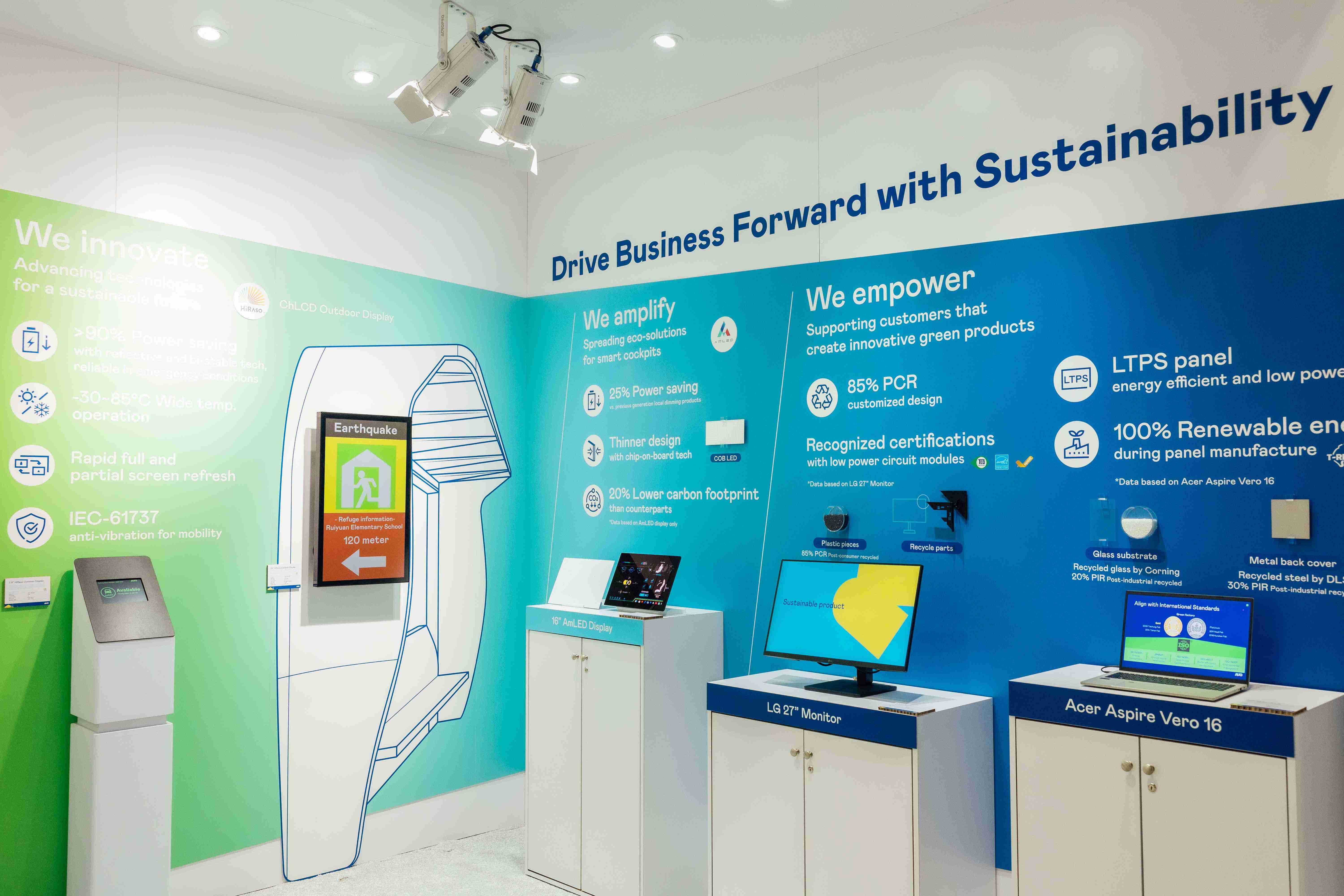 尊龙z6运用创新显示技术HiRaso胆固醇液晶双稳态技术达到显示零耗能、、扩大节能省电的AmLED显示技术应用于车用产品、、、以再生的消费后回收(PCR)塑料及全绿电生产之面板,,应用于笔电及萤幕,,,增加绿色价值。。。
