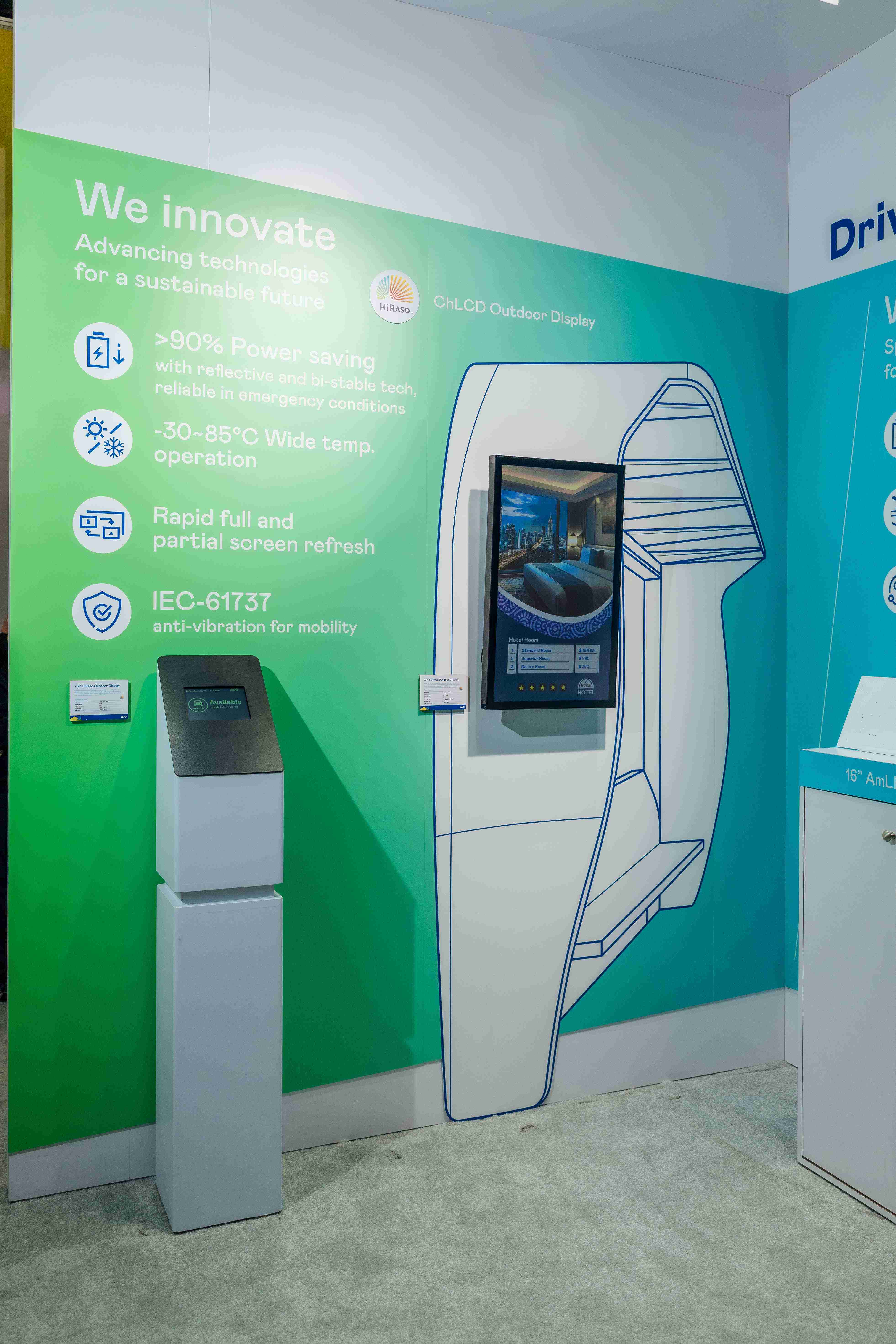 HiRaso胆固醇液晶显示器运用反射环境光线的方式,,,,呈现影像显示时零耗能的环保省电诉求,,光线愈强愈能呈现绝佳的色彩饱和度及显示效果,,同时在摄氏-30度至85度间宽温的使用优势,,,,为户外电子看板的新首选。。。。