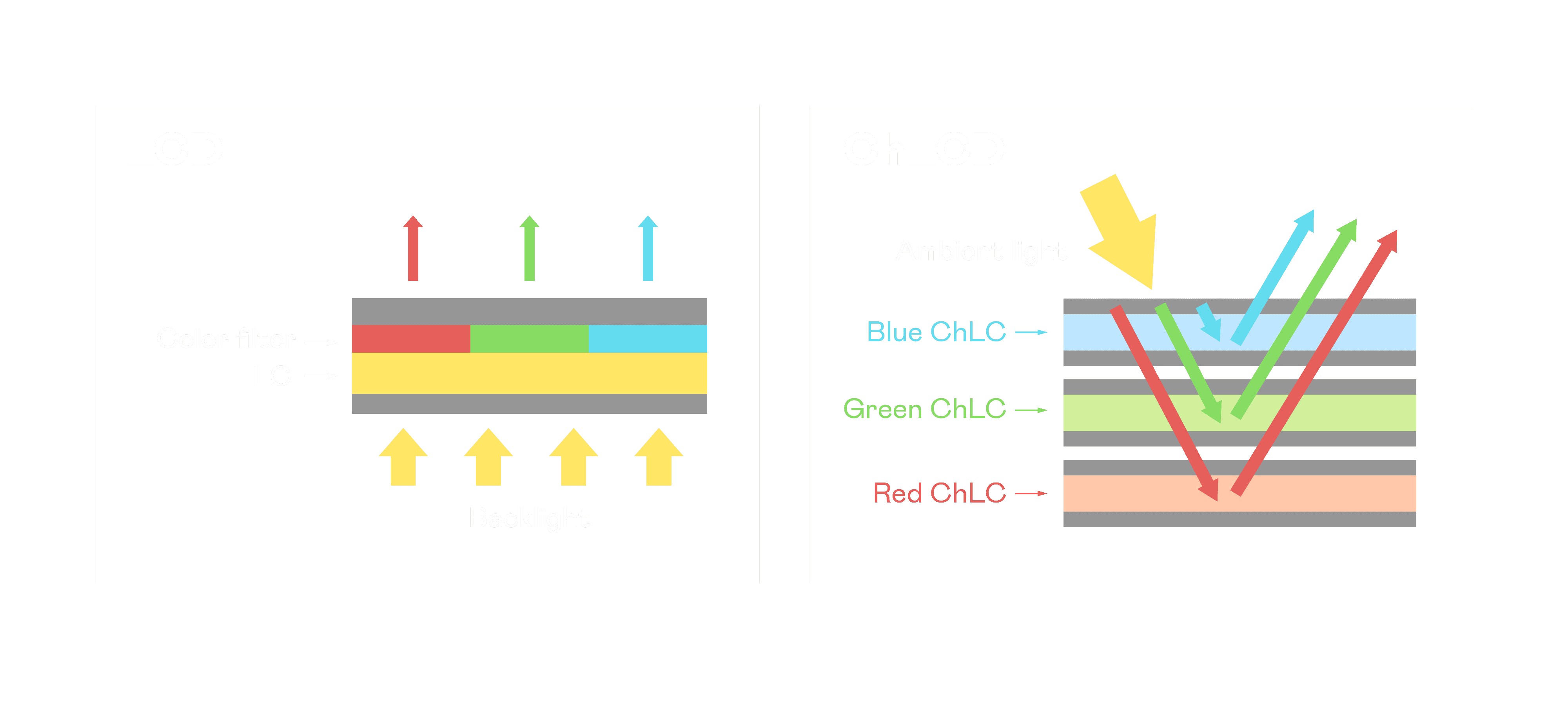 ChLCD 胆固醇液晶就如同纸张一样,,,透过反射环境光来显示影像,,,,因此长时间观看不易造成人眼视觉疲劳,,可达到护眼效果。。。当处于户外阳光下使用,,,,LCD 影像容易失真而不易观看,,,但胆固醇液晶仍可维持较佳的影像品质。。。。