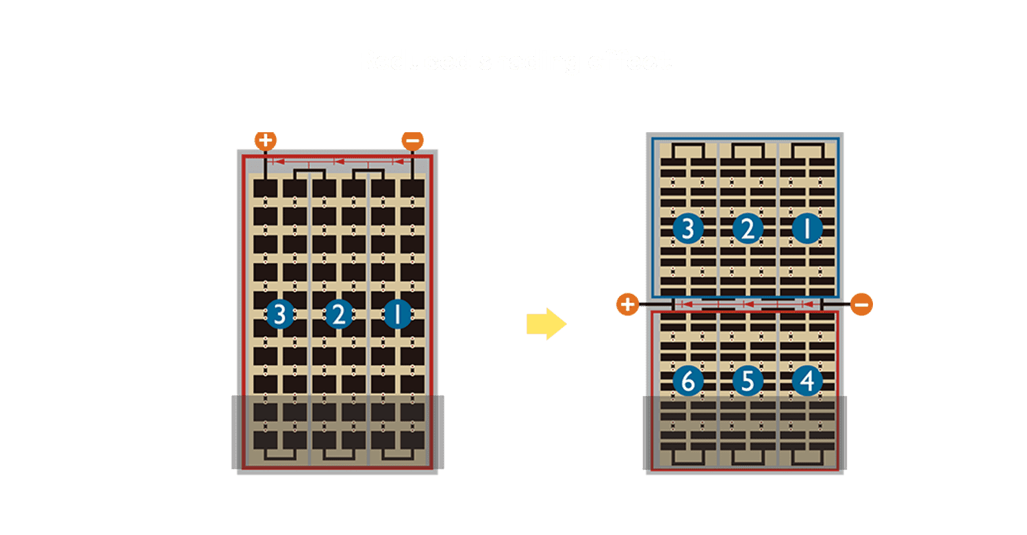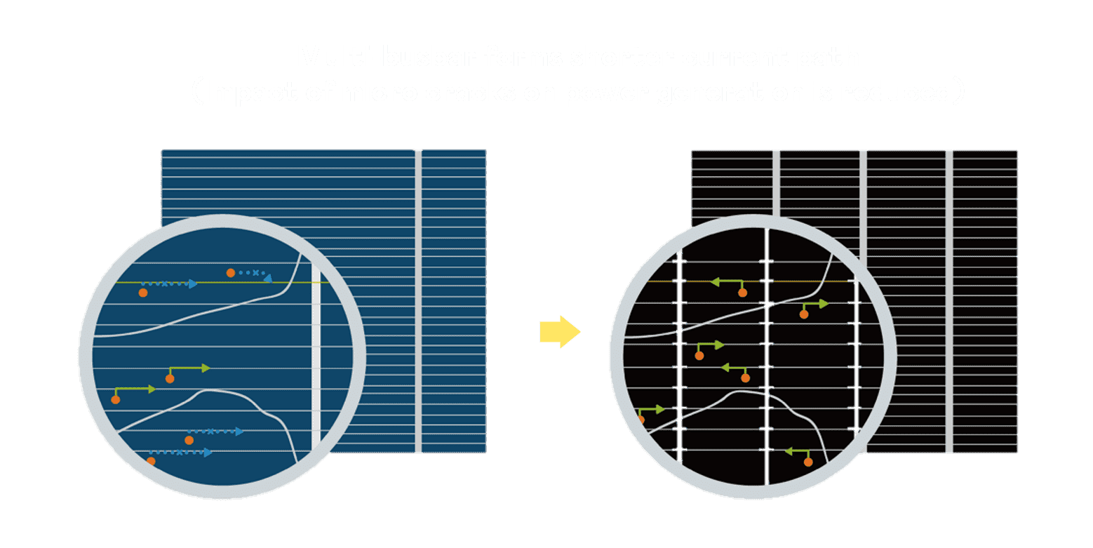 - 电池使用多条铜导线 (Copper wire) 于电池片上形成较短的电流路径,,提高电流收集效率,,,采用圆形设计的铜导线较传统扁平式的铜焊带 (Ribbon),,,可增加入射至电池的光线量。。。